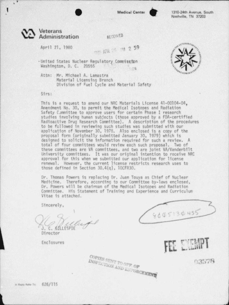 , e... /. Medical Center, 'Veterans hKAdministration131024th Avenue, South Nashville, TN 37203, 'atetWEDApril 21, 1980.RPR 'O In 2 59United States Nuclear Regulatory '. Comintern P3 Washington, D.