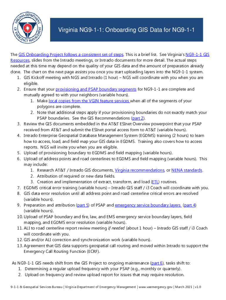 Virginia NG911: Onboarding GIS Data for NG911The GIS Onboarding Project follows a consistent set of steps. This is a brief list. See Virginia's NG911 GIS