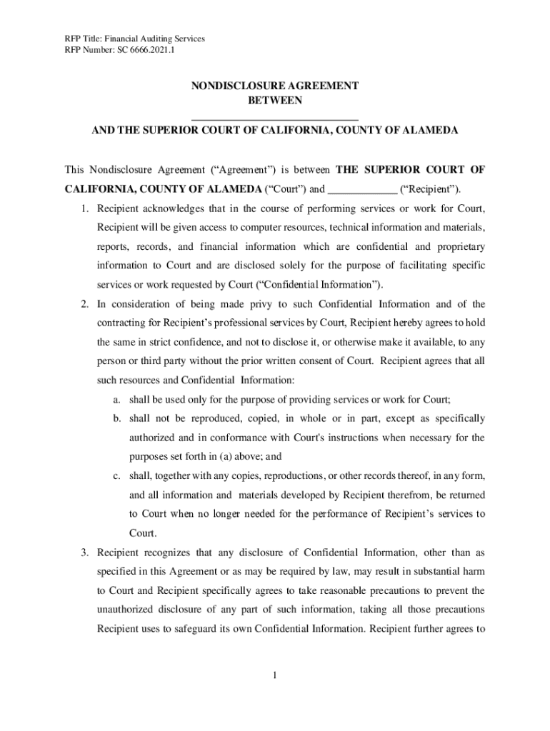 RFP Title: Financial Auditing Services RFP Number: SC 6666.2021.1NONDISCLOSURE AGREEMENT BETWEEN AND THE SUPERIOR COURT OF CALIFORNIA, COUNTY OF ALAMEDAThis Nondisclosure Agreement (Agreement) is