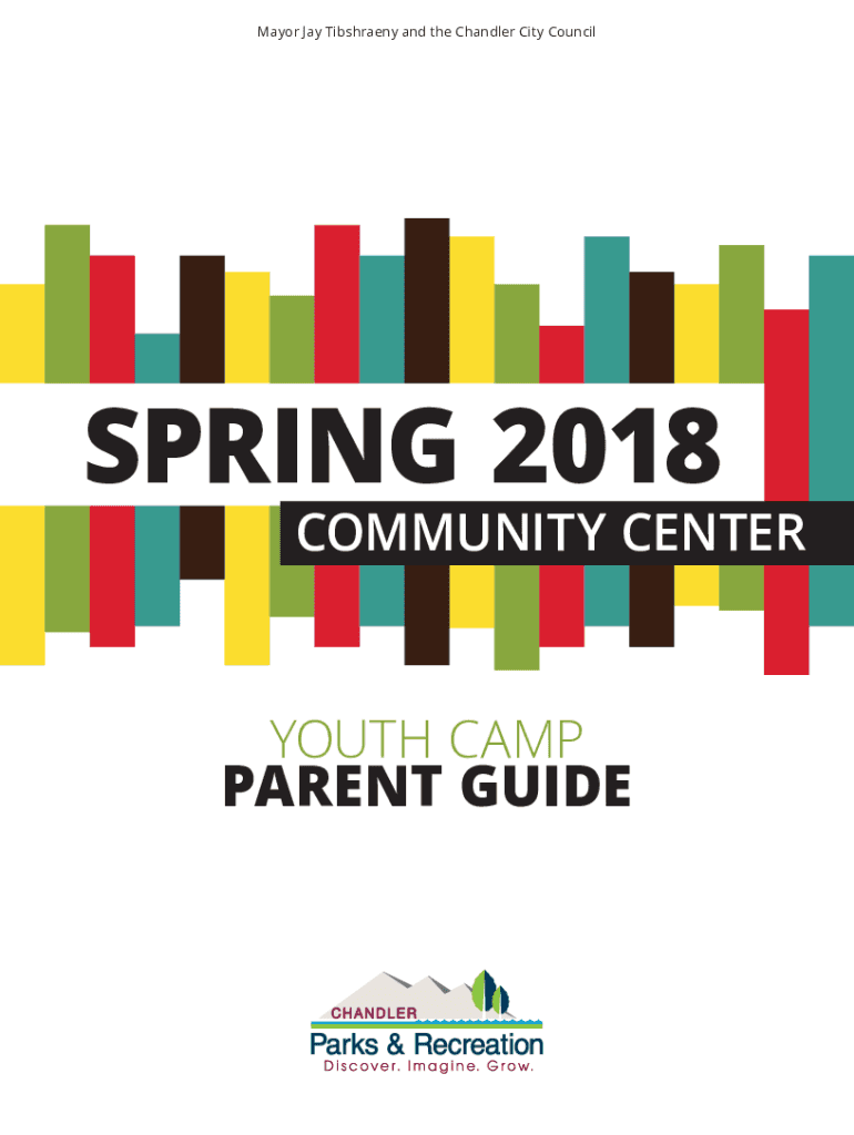 Mayor Jay Tibshraeny and the Chandler City CouncilSPRING 2018COMMUNITY CENTERYOUTH APPARENT GUIDESPRING SPRING 2018 2018YOUTH SPRING CAMP PARENT GUIDE TABLE OF CONTENTSFrequently Called Numbers. .