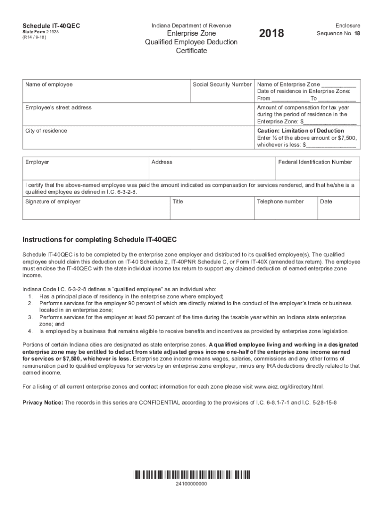 Schedule IT40QEC State Form 21928 (R14 / 918)Indiana Department of Revenue Enterprise Zone Qualified Employee Deduction CertificateName of employee2018Enclosure Sequence No. 18Social Security Number