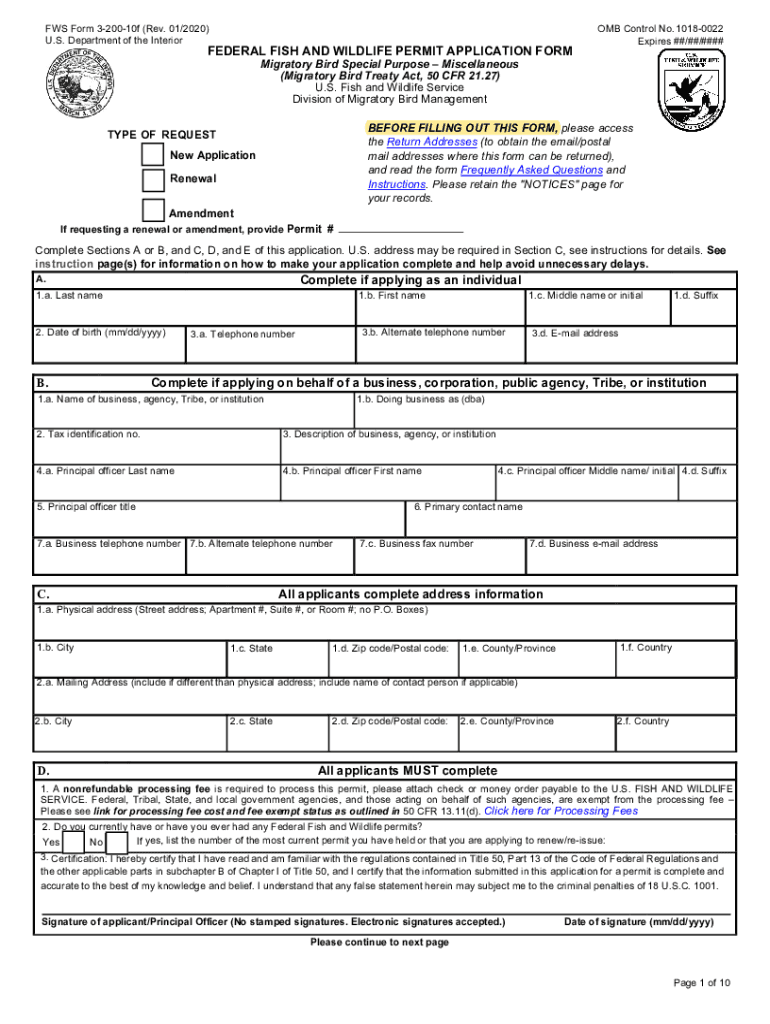 FRS Form 320010f (Rev. 01/2020) U.S. Department of the InteriorFEDERAL FISH AND WILDLIFE PERMIT APPLICATION FORM OMB Control No. 10180022 Expires ##/##/####Migratory Bird Special Purpose Miscellaneous