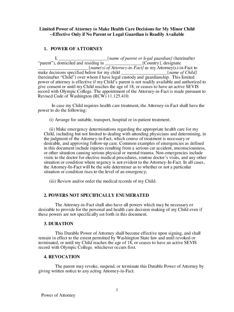 Limited Power of Attorney to Make Health Care Decisions for My Minor Child Effective Only if No Parent or Legal Guardian is Readily Available 1. POWER OF ATTORNEY I, name of parent or legal guardian