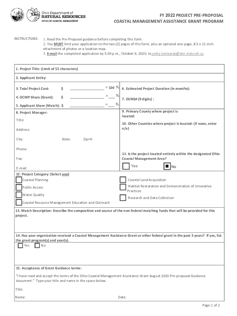 COASTAL MANAGEMENT ASSISTANCE GRANT PROGRAMINSTRUCTIONS:1. Read the Proposal guidance before completing this form.