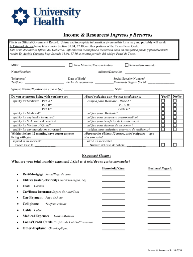 University Health Income & Resources/ Ingress y RecursosThis is an Official Government Record. Untrue and incomplete information given on this form may and probably will result In Criminal Action