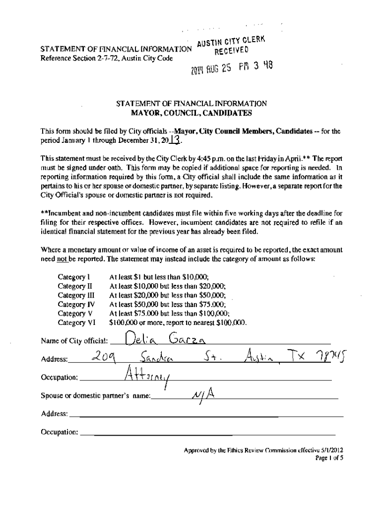 STATEMENT OF FINANCIAL INFORMATION Reference Section 2772, Austin City CodeAUSTIN CITY CLERK Received RUG 25 PRL 3 98STATEMENT OF FINANCIAL INFORMATION MAYOR, COUNCIL, CANDIDATES This form should