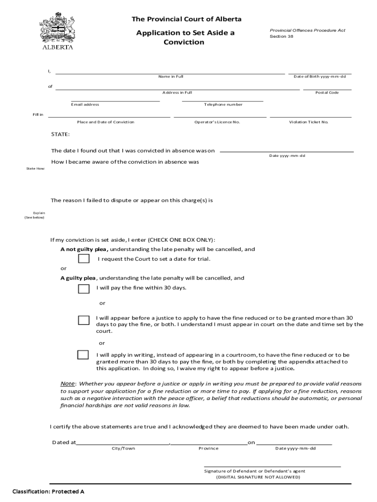 Application to Set Aside a Conviction PROCEDURES FOR APPLICATIONS TO SET ASIDE CONVICTIONS To make an application to set aside a conviction under section 38 of the Provincial Offenses Procedure Act