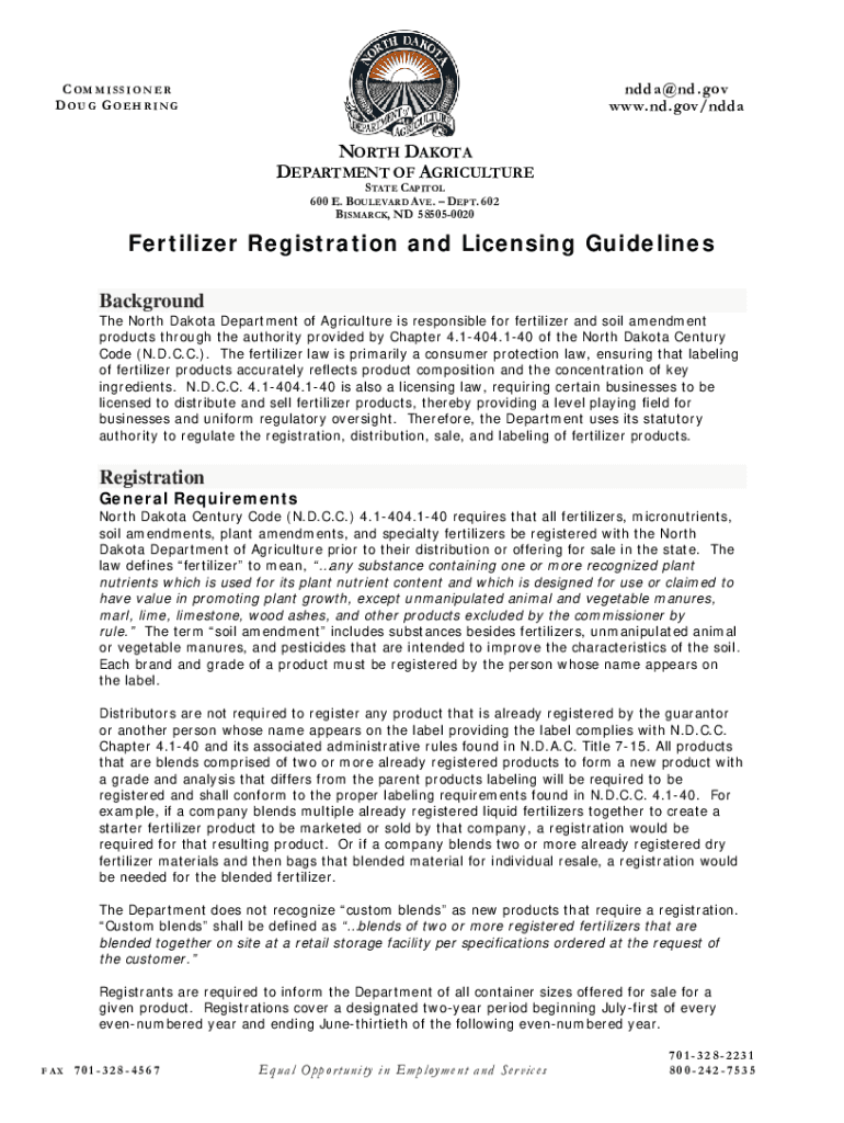 Edda ND.gov www.nd.gov/nddaCOMMISSIONER DOUG GOEHRINGNORTH DAKOTA DEPARTMENT OF AGRICULTURE STATE CAPITOL 600 E. BOULEVARD AVE. DEPT. 602 BISMARCK, ND 585050020Fertilizer Registration and Licensing