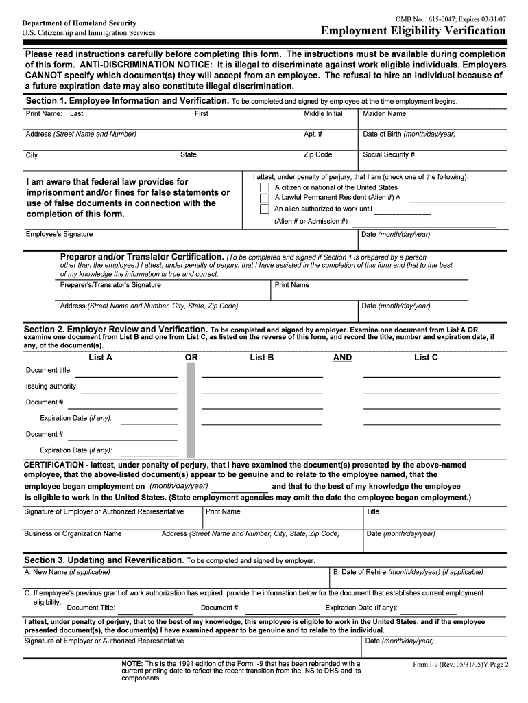 OMB No. 1615-0047; Expires 03/31/07 Department of Homeland Security U.S. Citizenship and Immigration Services Employment Eligibility Verification INSTRUCTIONS PLEASE READ ALL INSTRUCTIONS CAREFULLY