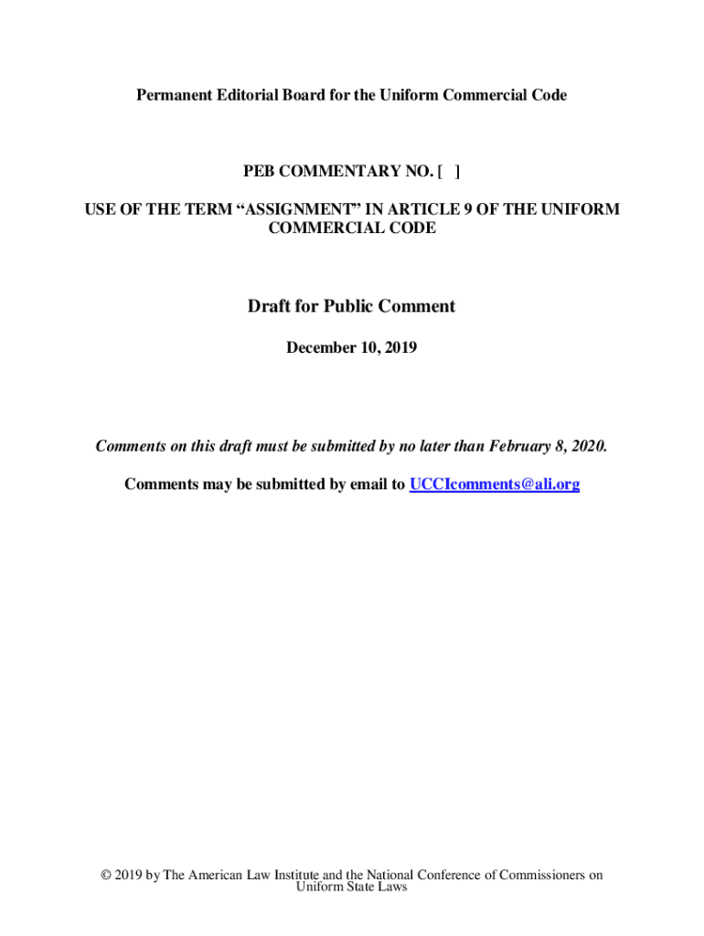 Permanent Editorial Board for the Uniform Commercial Code PEB COMMENTARY NO. USE OF THE TERM ASSIGNMENT IN ARTICLE 9 OF THE UNIFORM COMMERCIAL CODED raft for Public Comment December 10, 2019Comments