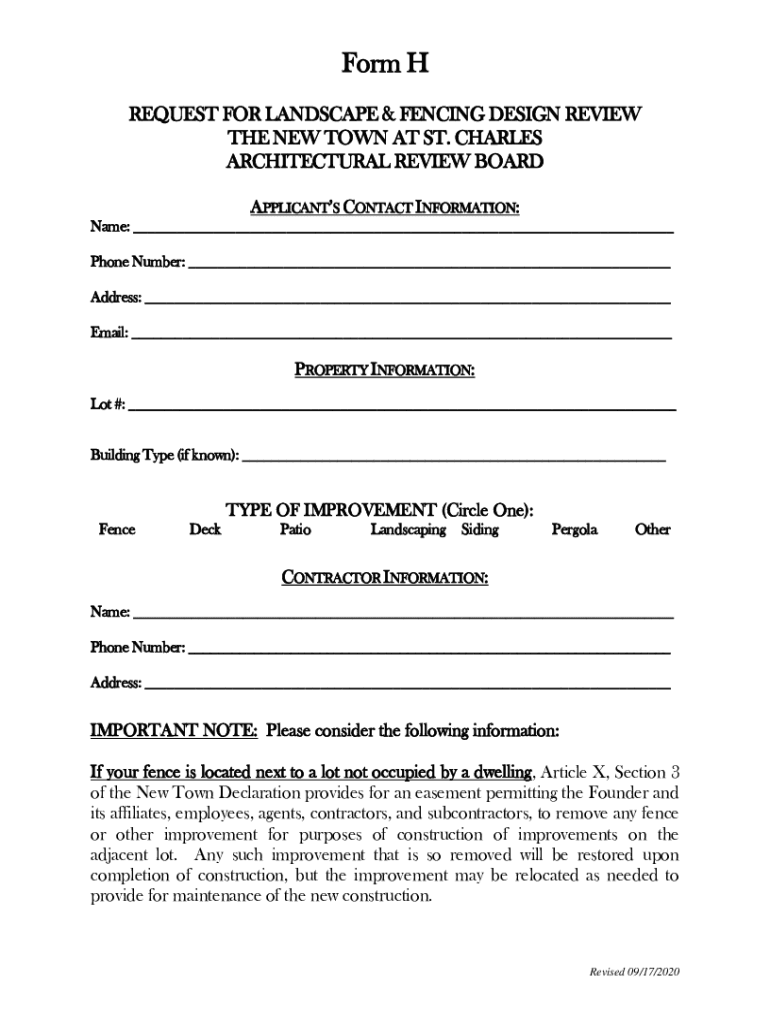 Form H REQUEST FOR LANDSCAPE & FENCING DESIGN REVIEW THE NEW TOWN AT ST. CHARLES ARCHITECTURAL REVIEW BOARD APPLICANTS CONTACT INFORMATION: Name: Phone Number: Address: Email: PROPERTY INFORMATION: