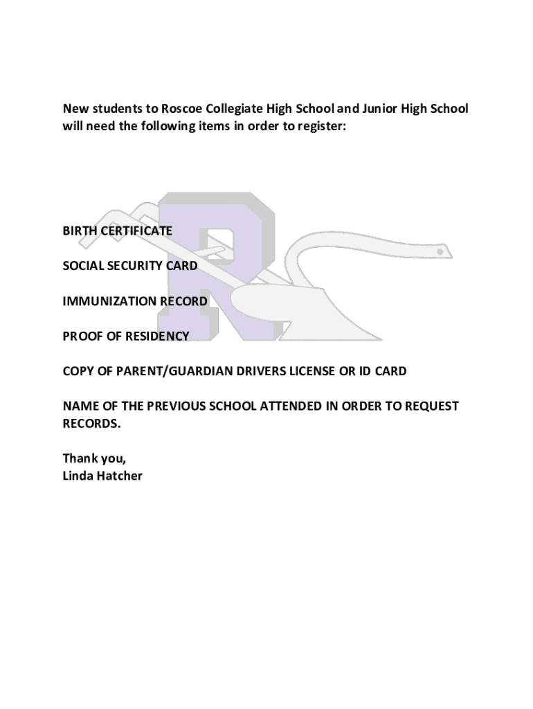 New students to Roscoe Collegiate High School and Junior High School will need the following items in order to register:BIRTH CERTIFICATE SOCIAL SECURITY CARD IMMUNIZATION RECORD PROOF OF RESIDENCY