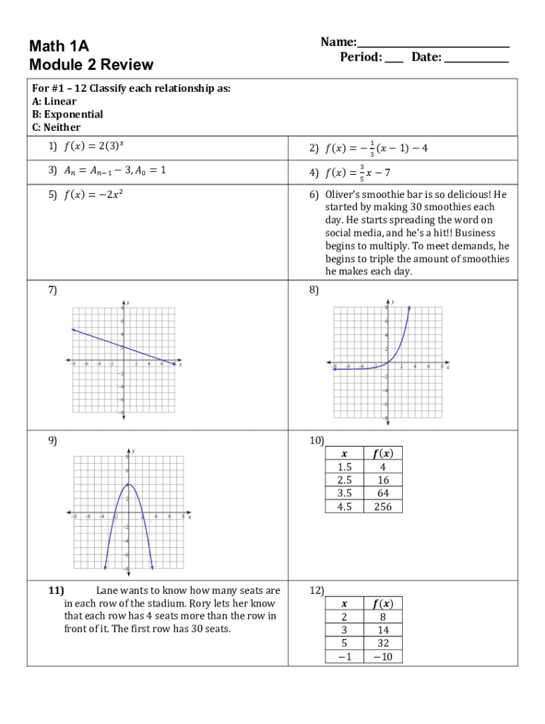 Algebra 1 Math 1A Unit 2 ART: Multiple Choice Module 2 Reviewer #1 12 Classify each relationship as: A: Linear B: Exponential C: NeitherName: Period: Date: 1) () 2(3)2) () 3 (1) 43) 1 3, 0 14) ()
