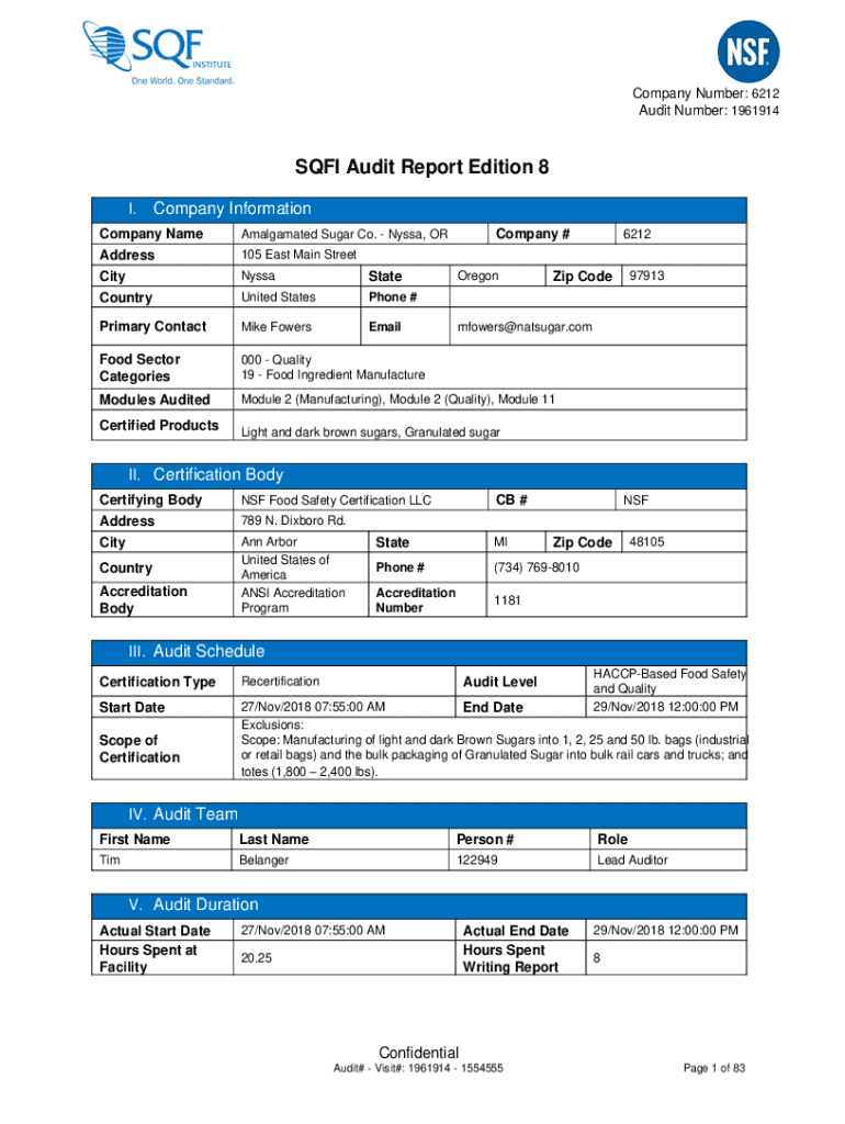 Company Number: 6212 Audit Number: 1961914SQFI Audit Report Edition 8 I. Company InformationCompany Name Address City CountryAmalgamated Sugar Co. Nyasa, Company #6212105 East Main Street NyssaStateUnited