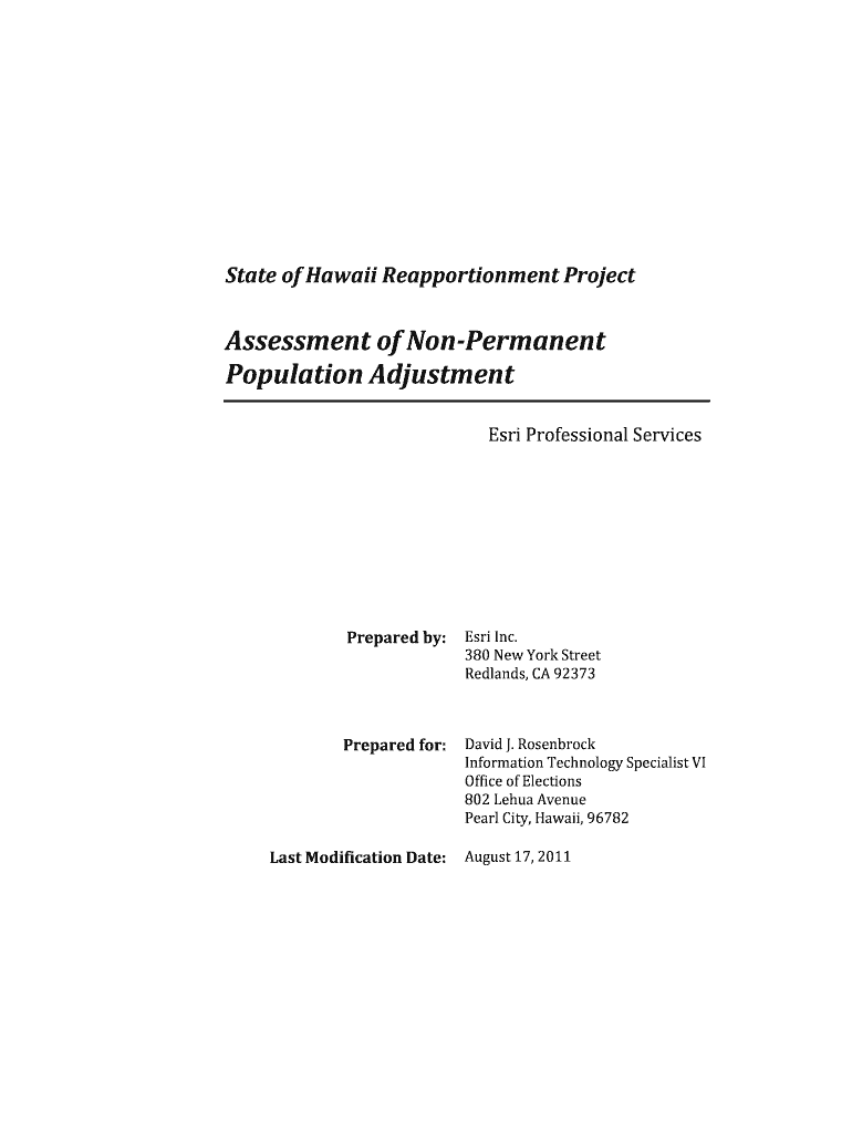 State of Hawaii Reapportionment Project Assessment of Non-Permanent Population Adjustment Esri Professional Services Prepared by: Esri Inc. 380 New York Street Redlands, CA 92373 Prepared for: David