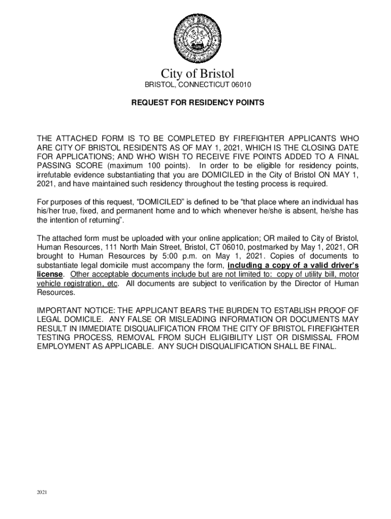 City of Bristol, CONNECTICUT 06010REQUEST FOR RESIDENCY POINTS ATTACHED FORM IS TO BE COMPLETED BY FIREFIGHTER APPLICANTS WHO