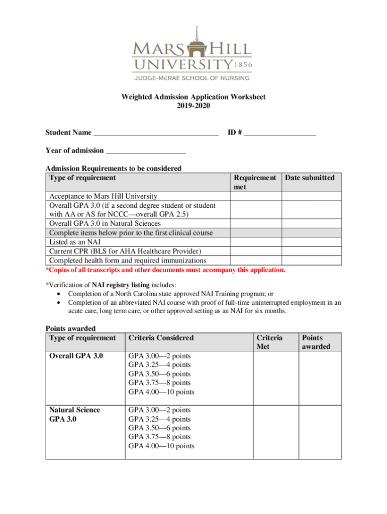 Weighted Admission Application Worksheet 20192020Student Name ID # Year of admission Requirements to be considered Type of requirementRequirement mandate submittedAcceptance to Mars Hill University
