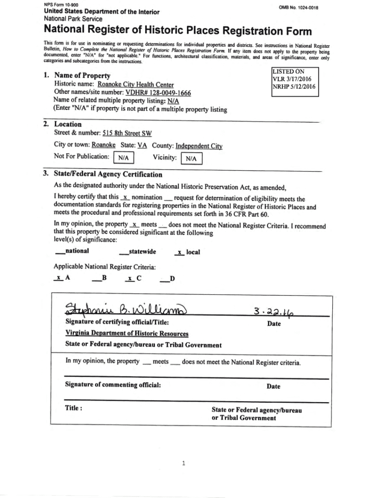 United States Department of the Interior National Park Service / National Register of Historic Places Registration Form NPS Form 10900OMB No. 10240018Roanoke City Health Center Name of Property Roanoke,