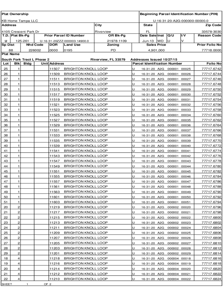Plat OwnershipBeginning Parcel Identification Number (PIN)KB Home Tampa LLC