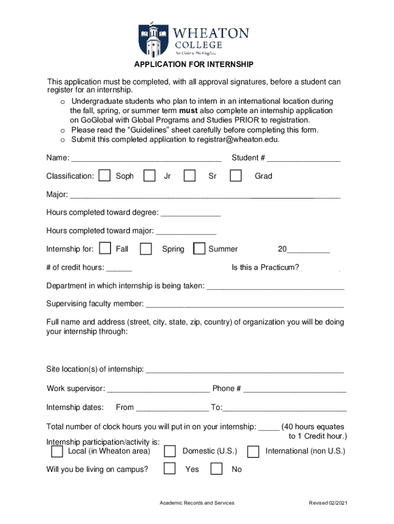 Wheaton college application for internship is a form or document that students need to submit in order to apply for internship opportunities provided by Wheaton College.