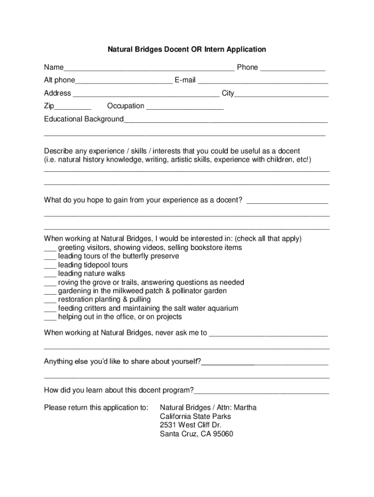 Natural Bridges Docent OR Intern Application Name Phone Alt phone Email Address City Zip Occupation Educational Background Describe any experience / skills / interests that you could be useful as