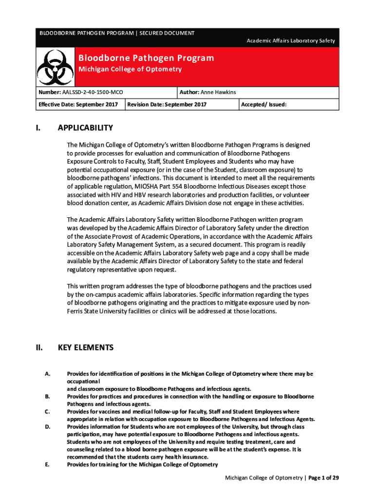 BLOOD-BORNE PATHOGEN PROGRAM SECURED DOCUMENTAcademic Affairs Laboratory SafetyBloodborne Pathogen Program Michigan College of Optometry Number: AALSSD2401500MCO Effective Date: September 2017I. Author: