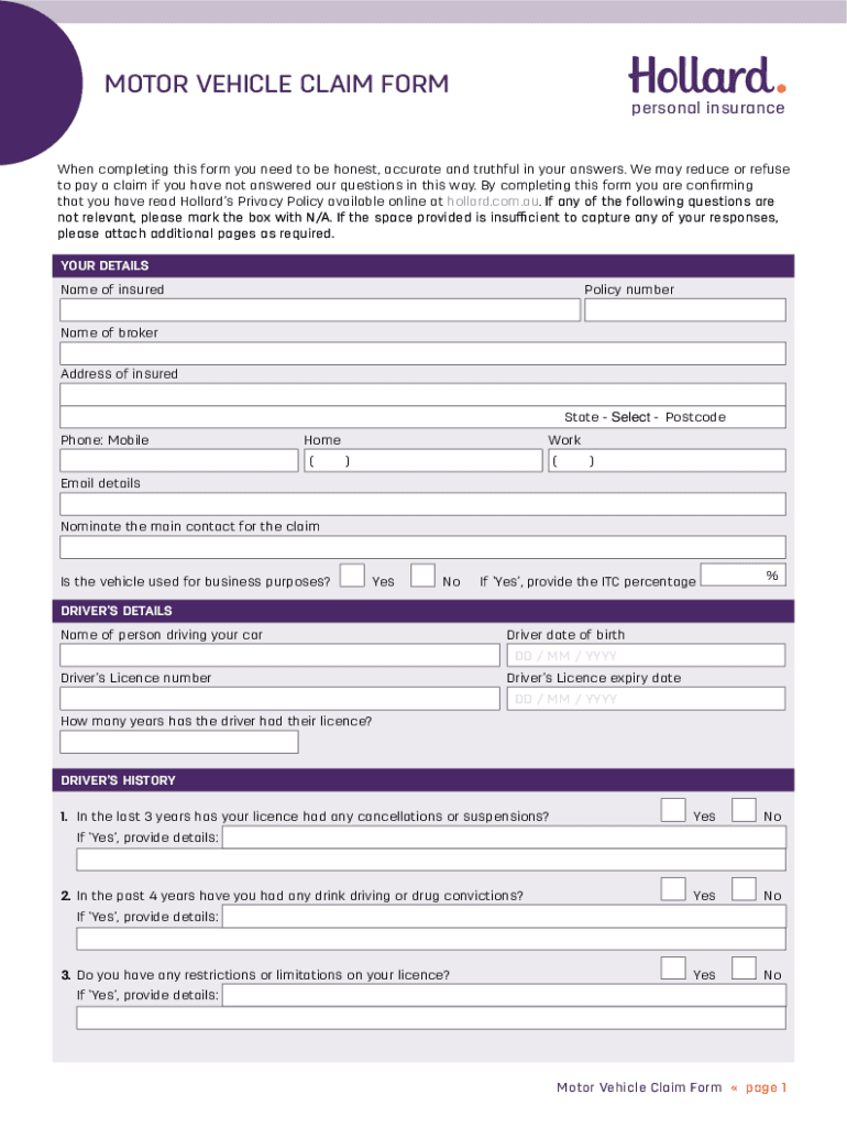 MOTOR VEHICLE CLAIM FORM personal insuranceWhen completing this form you need to be honest, accurate and truthful in your answers. We may reduce or refuse