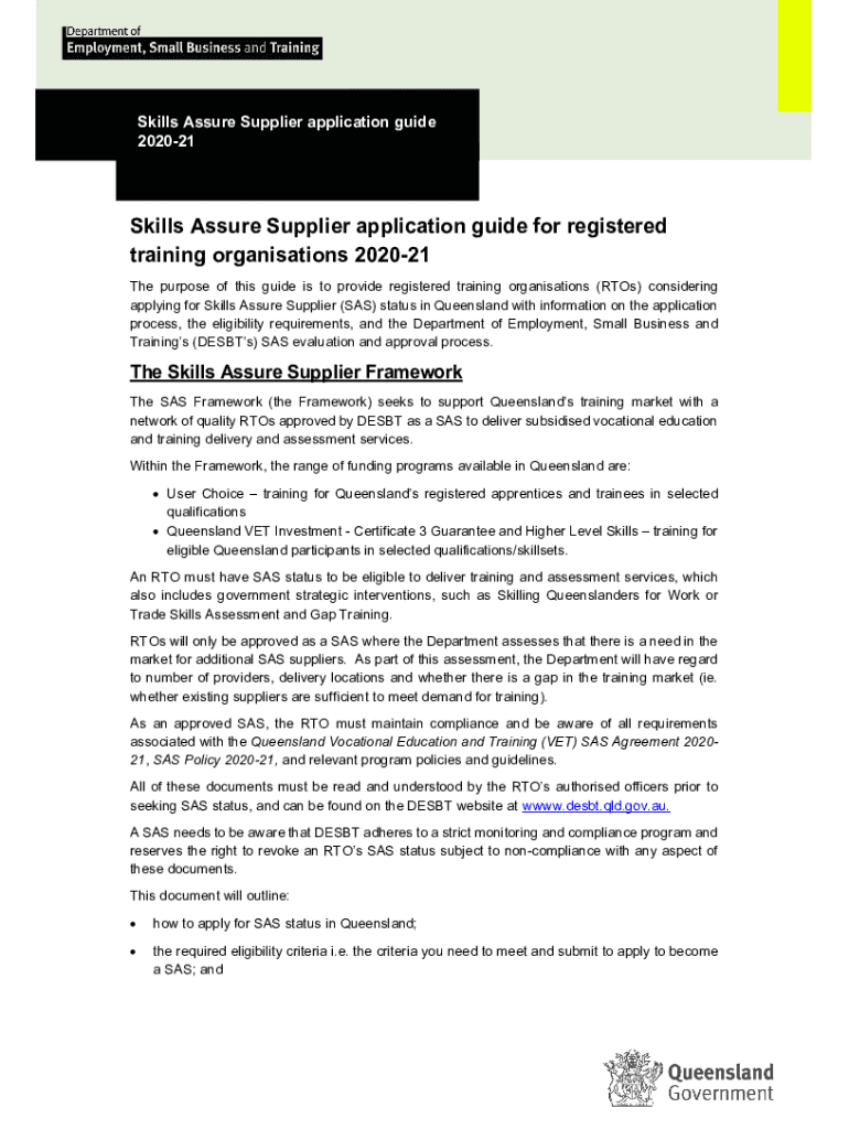 The Skills Assure Supplier application is needed by skills training organizations or suppliers who wish to become official providers of training services under the Skills Assure funding program. This program is designed to support individuals in gaining the skills and qualifications needed for employment in high-demand industries. By becoming a Skills Assure Supplier, organizations can access government funding and offer approved training programs to eligible learners.