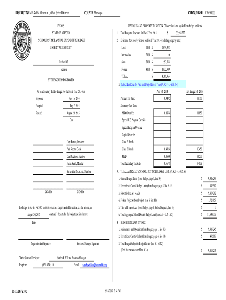 DISTRICT NAME Saddle Mountain Unified School DistrictCOUNTY Maricopa NUMBER FY 2015070290000REVENUES AND PROPERTY TAXATION (This section is not applicable to budget revisions)STATE OF ARIZONA