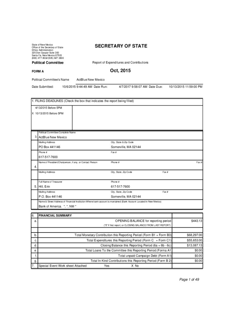 (800) 4773632/(505) 8273600SECRETARY OF STATEPolitical CommitteeReport