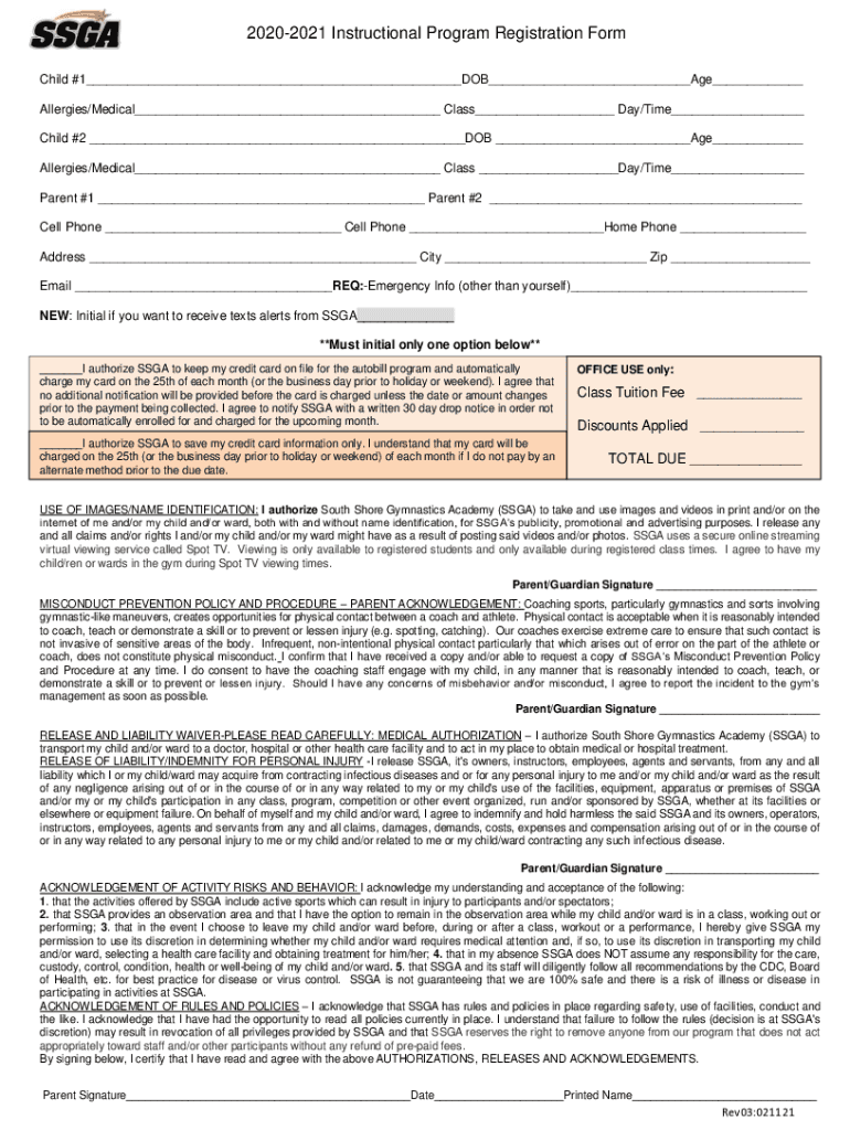 20202021 Instructional Program Registration Form Child #1 DOB Age Allergies/Medical Class Day/Time Child #2 DOB Age Allergies/Medical Class Day/Time Parent #1 Parent #2 Cell Phone Home Phone Address