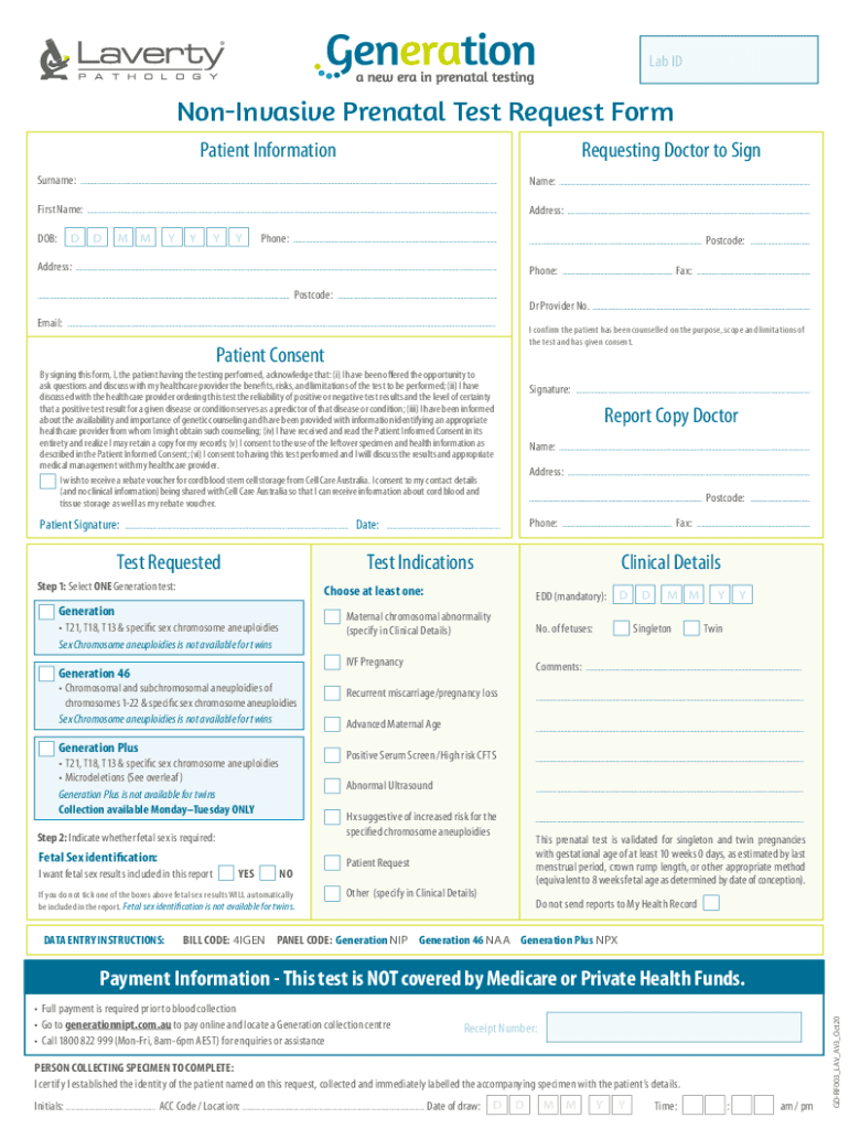 Next, fill in the details of the patient for whom the NIPT is being requested. This includes their name, date of birth, and any relevant medical history.