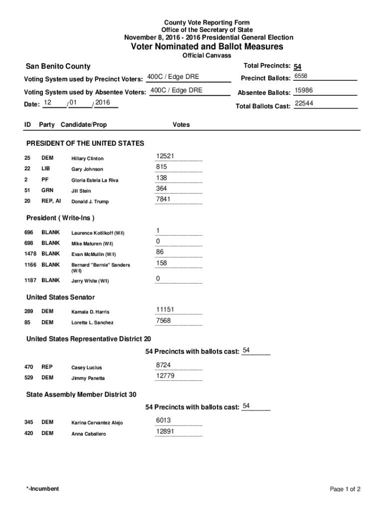 SAN BENITO COUNTY DEPARTMENT OF ELECTIONSOFFICIAL CANVASS STATEMENT OF VOTE PRESIDENTIAL GENERAL ELECTION November 8, 2016Website: www.sbcvote.us Email: Gonzalez cost.us FAX (831) 6362939440 Fifth