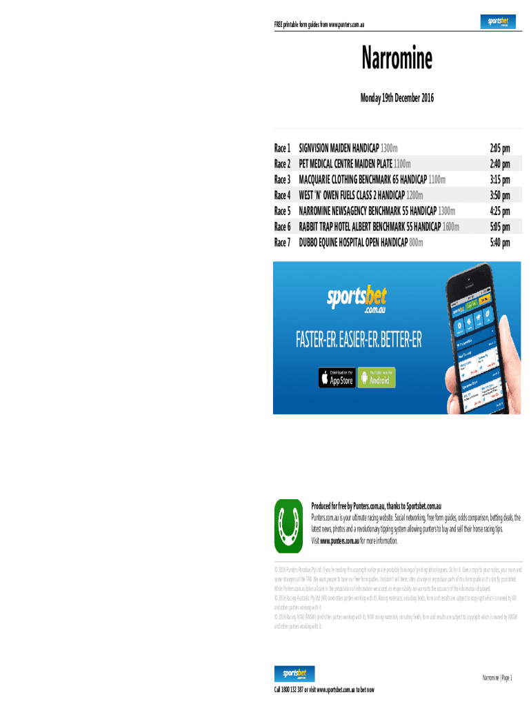 FREE printable form guides from www.punters.com.auNarromine Monday 19th December 2016Race 1 Race 2 Race 3 Race 4 Race 5 Race 6 Race 7SIGNVISION MAIDEN HANDICAP 1300 m PET MEDICAL Center MAIDEN PLATE