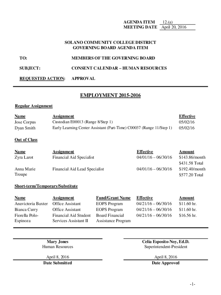 AGENDA ITEM 12.(a) MEETING DATE April 20, 2016SOLANO COMMUNITY COLLEGE DISTRICT GOVERNING BOARD AGENDA ITEM TO:MEMBERS OF THE GOVERNING BOARDSUBJECT:CONSENT CALENDAR HUMAN RESOURCESREQUESTED ACTION:APPROVALEMPLOYMENT