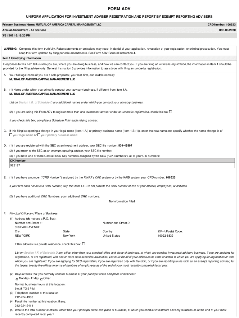 FORM ADV UNIFORM APPLICATION FOR INVESTMENT ADVISER REGISTRATION AND REPORT BY EXEMPT REPORTING ADVISERS Primary Business Name: MUTUAL OF AMERICA CAPITAL MANAGEMENT LLC CRD Number: 106523Annual Amendment