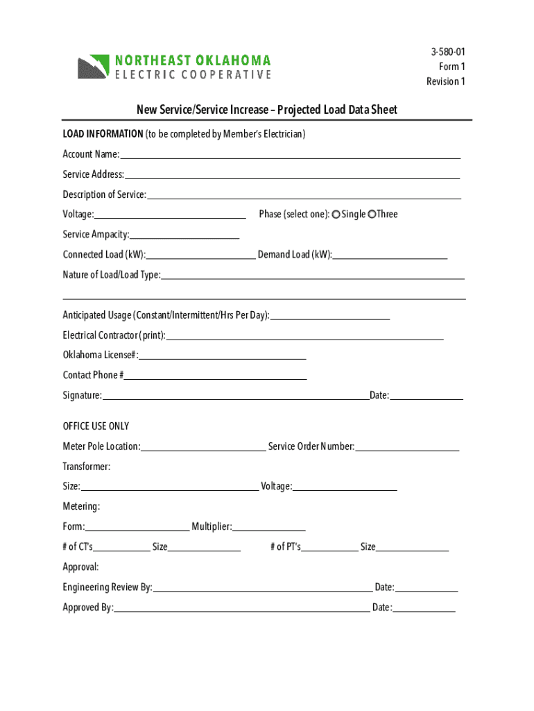 Get the free New Service/Service Increase Projected Load Data Sheet