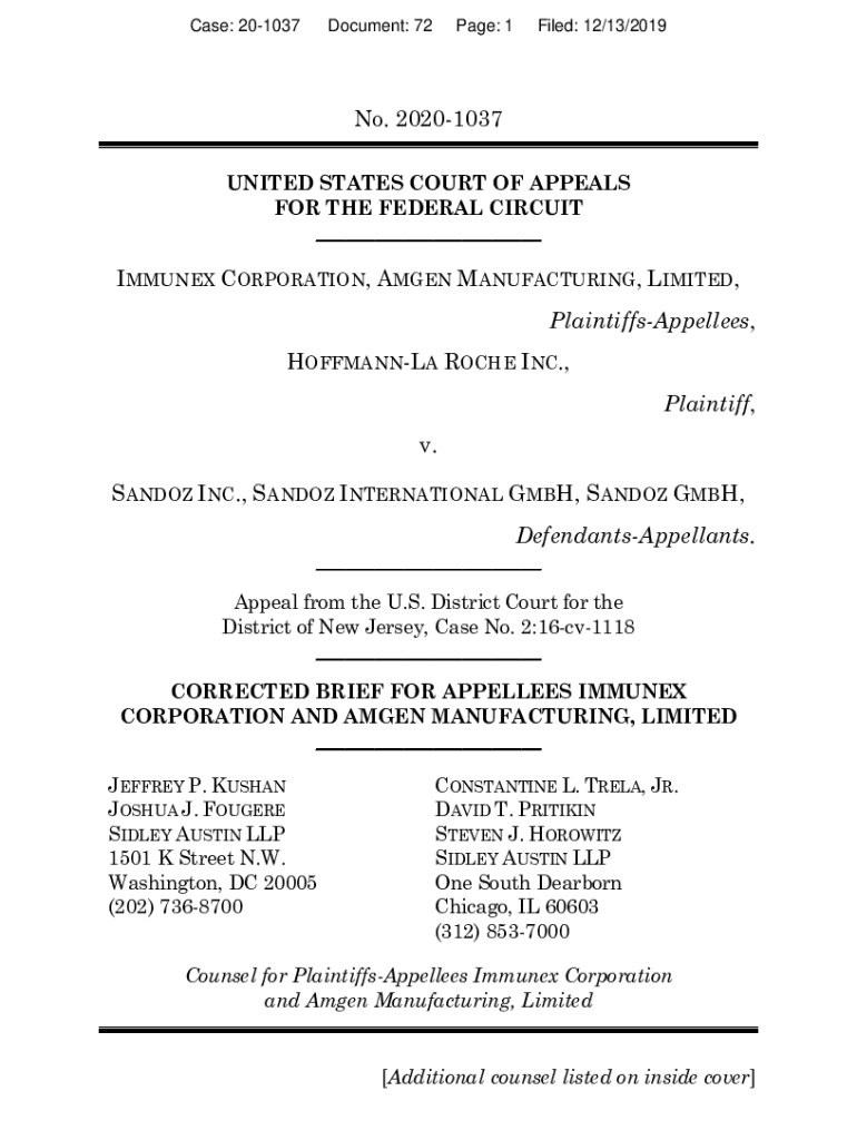 Case: 201037Document: 72Page: 1Filed: 12/13/2019No. 20201037 UNITED STATES COURT OF APPEALS FOR THE FEDERAL CIRCUIT IMMUNE CORPORATION, AMGEN MANUFACTURING, LIMITED, PlaintiffsAppellees, HOFFMANN