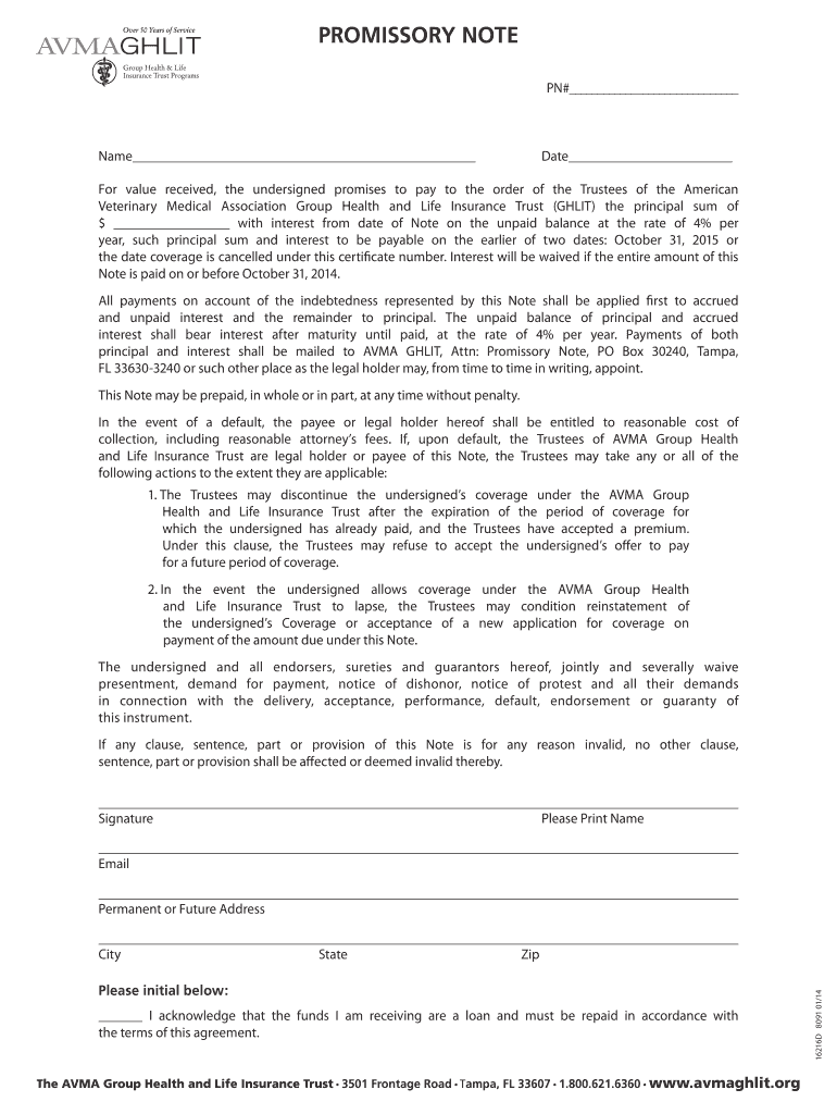 Signing and Submitting the Promissory Note for AVMA Group Health and Life Insurance Trust