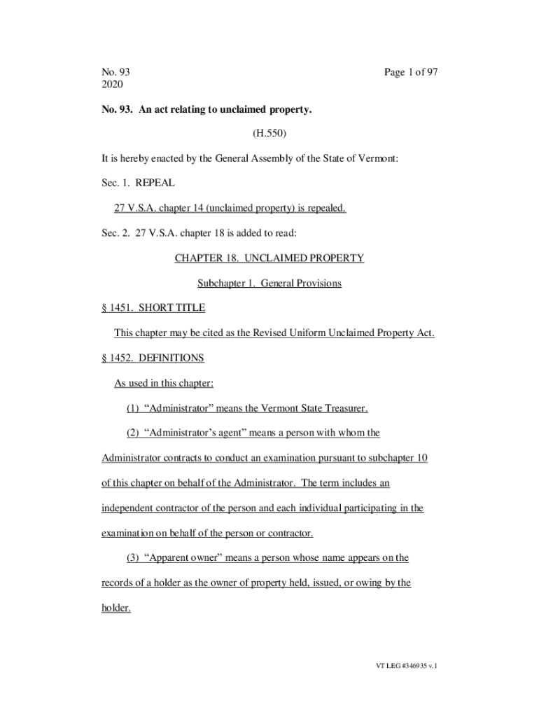 No. 93 2020Page 1 of 97No. 93. An act relating to unclaimed property. (H.550) It is hereby enacted by the General Assembly of the State of Vermont: Sec. 1. REPEAL 27 V.S.A. chapter 14 (unclaimed property)