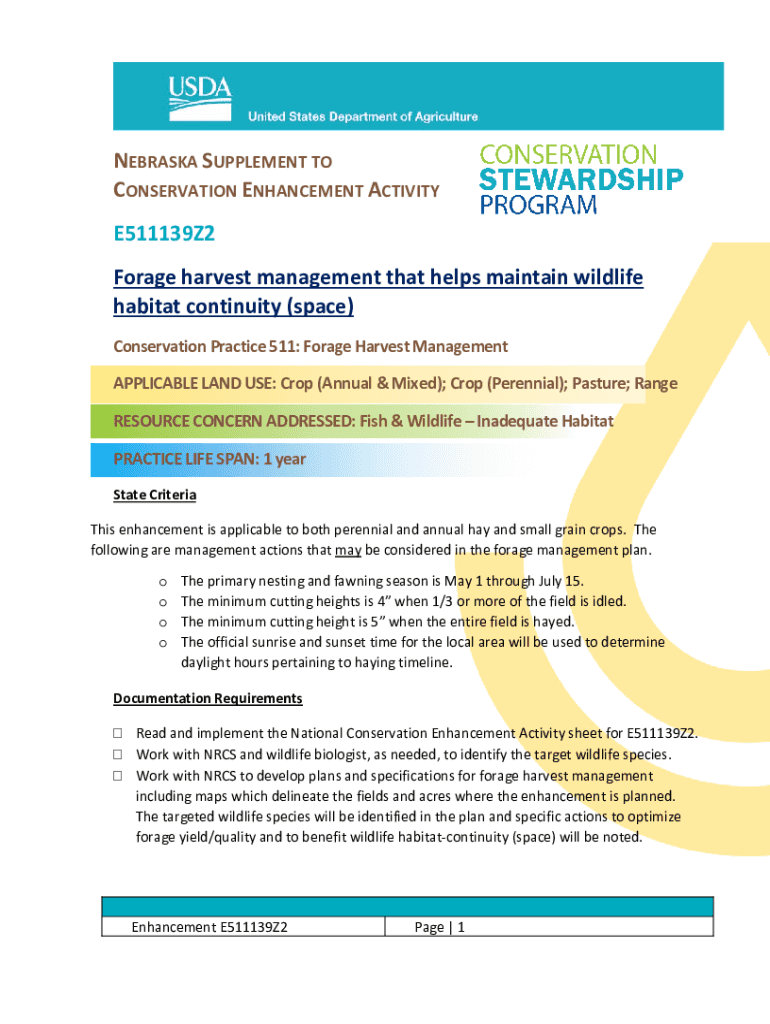 NEBRASKA Supplements TO CONSERVATION ENHANCEMENT ACTIVITY E511139Z2 Forage harvest management that helps maintain wildlife habitat continuity (space) Conservation Practice 511: Forage Harvest Management