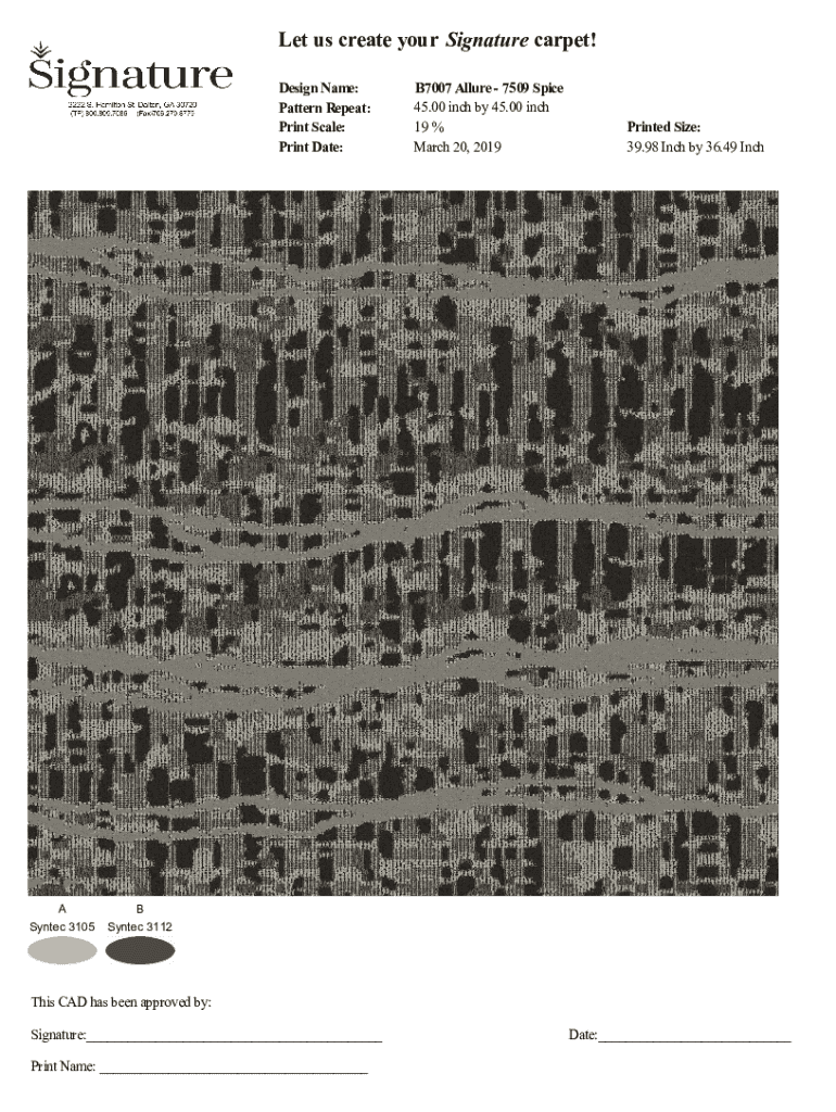 Let us create your Signature carpet! Design Name: Pattern Repeat: Print Scale: Print Date:A System 3105B7007 Allure 7509 Spice 45.00 inch by 45.00 inch 19 % March 20, 2019Printed Size: 39.98 Inch
