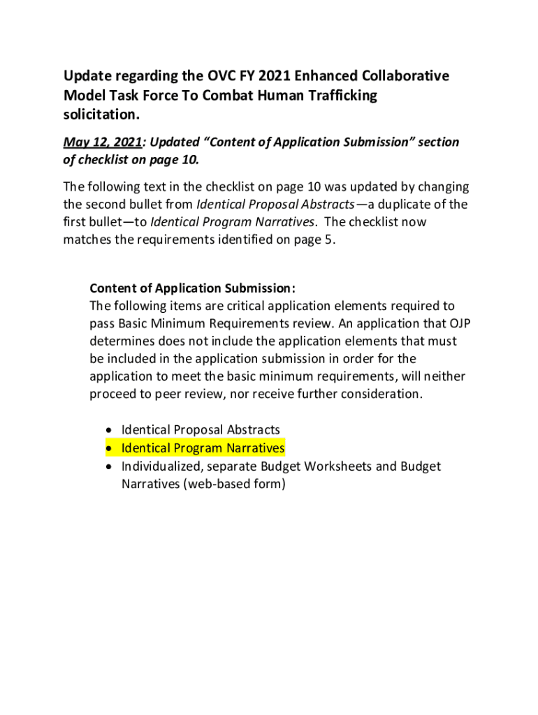 Update regarding the PVC FY 2021 Enhanced Collaborative Model Task Force To Combat Human Trafficking solicitation. May 12, 2021: Updated Content of Application Submission section of checklist on page