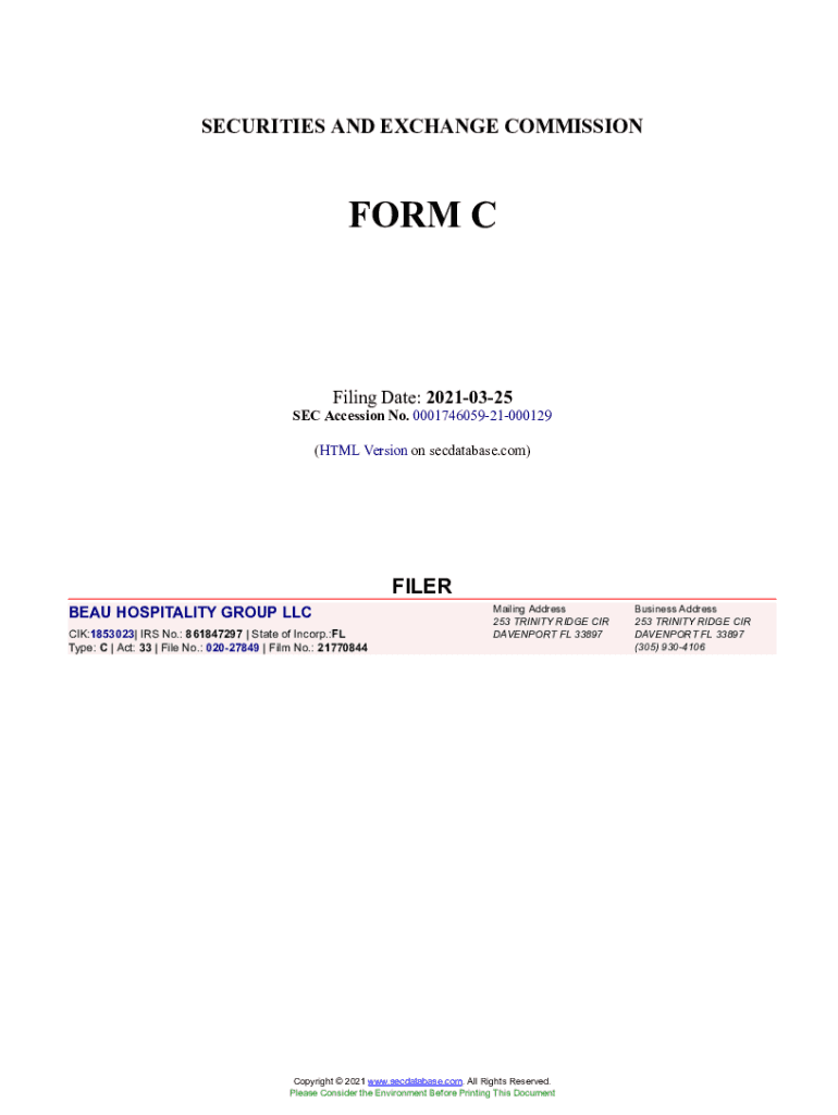 Get the free BEAU HOSPITALITY GROUP LLC Form C Filed 2021-03-25. Accession Number