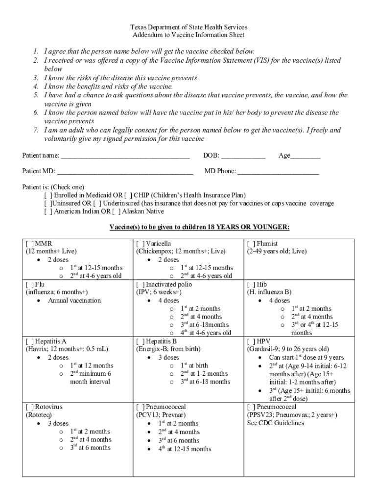 Texas Department of State Health Services Addendum to Vaccine Information Sheet1. I agree that the person name below will get the vaccine checked below. 2. I received or was offered a copy of the