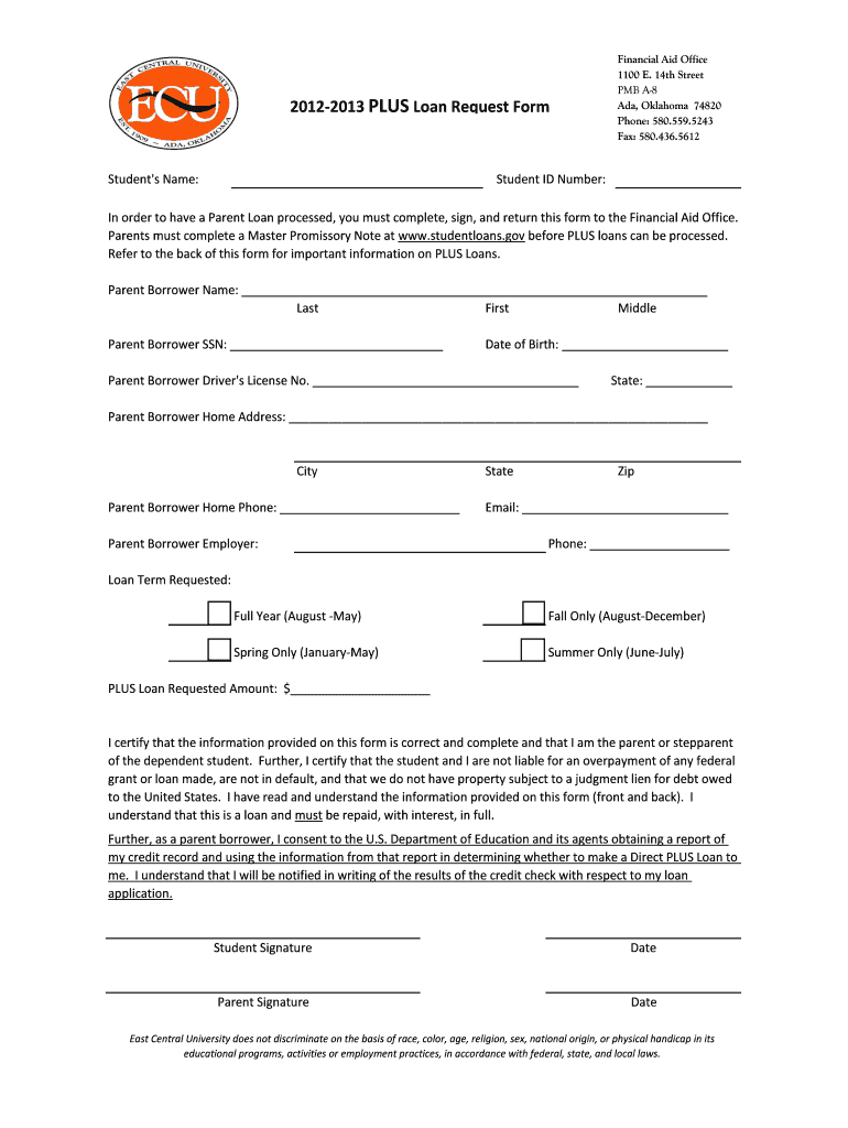 2012-2013 PLUS Loan Request Form Student's Name: Financial Aid Office 1100 E. 14th Street PMB A-8 Ada, Oklahoma 74820 Phone: 580.559.5243 Fax: 580.436.5612 Student ID Number: In order to have a Parent