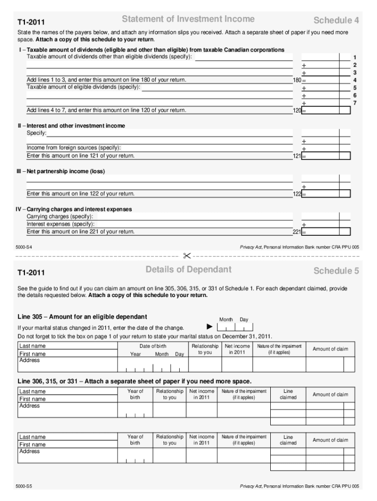 5000-S4-5 T1 General 2011 — Schedule 4 — Statement of Investment Income — Schedule 5 — Details of Dependent — Common to all — Newfoundland and Labrador. Choose a blank template from the