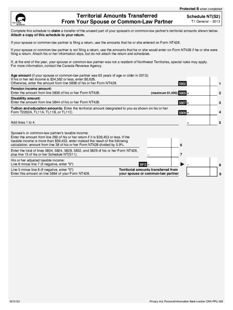 5012-S2 T1 General 2013 — Schedule NT(S2) — Territorial Amounts Transferred from Your Spouse or Common-Law Partner — Northwest Territories. Choose a blank template from the list and complete