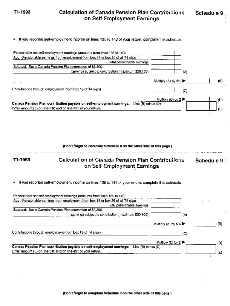 5010-S9 Schedule 9 — British Columbia — T1 General 1993 — Calculation of Canada pension plan contributions to self-employment earnings. Choose a blank template from the list and complete it
