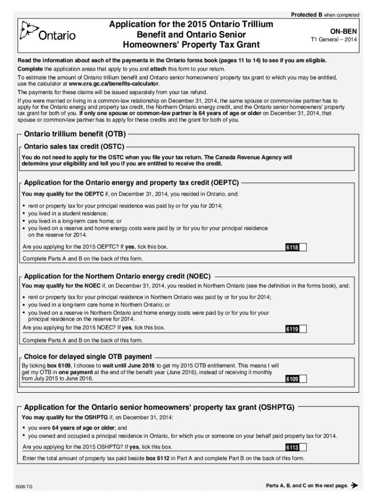 5006-TG T1 General 2014 — ON-BEN Application for the 2015 Ontario Trillium Benefit and the Ontario Senior Homeowners\' Property Tax Grant. Choose a blank template from the list and complete it instantly.